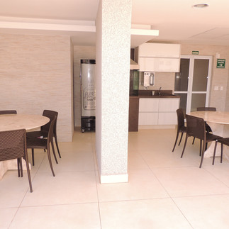 Salão de Festas e Área da Piscina - Bancadas em granito Marrom Café. Tampos de Mesas em mármore Bege Bahia.
